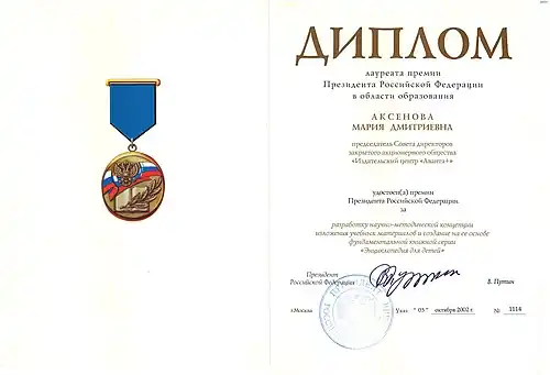 - ↑ Указ Президента Российской Федерации от 05.10.2003 г. № 1178 «О присуждении премий Президента Российской Федерации в области образования за 2002 год»