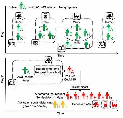 Отслеживание контактов является важным фактором контроля инфекционных заболеваний. Отслеживание контактов более эффективно на более ранних стадиях вспышки, чем на более поздних стадиях, когда большая часть сообщества в любом случае самоизолируется. Цифровая трассировка контактов, особенно если она широко применяется, может быть более эффективной, чем традиционные методы отслеживания контактов. Некоторые сторонники выступают за принятие законодательства, освобождающего определенные приложения COVID-19 от предыдущих общих ограничений конфиденциальности.[44] В марте 2020 года модель профессора Кристофа Фрейзера из Института больших данных Оксфордского университета показывает, что вспышка коронавируса в городе с населением в один миллион человек остановлена, если 80 % всех пользователей смартфонов используют систему отслеживания. Согласно этой модели, пожилые люди все еще должны самоизолироваться в массовом порядке, но лица, которые не имеют симптомов и не являются пожилыми, освобождаются от изоляции, если только они не получают предупреждение о том, что им грозит риск заболевания.[45][46]