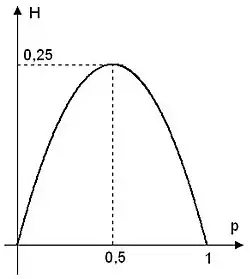 Её график зависимости от очень похож на перевернутую параболу, проходящую через начало координат. Максимум достигается в точке . Кроме того, эта функция зеркально симметрична относительно линии . Это следует из того, что . Поэтому, исходя из графика, любое изменение вероятностей в сторону выравнивания приводит к увеличению энтропии.