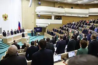 Юридическое оформление института присяги судьи КС РФ отражено в Федеральном конституционном законе «О Конституционном суде Российской Федерации» от 21 июля 1994 года, №1-ФКЗ. Согласно статье 12 ФКЗ, принесение присяги является юридическим фактом (действием), с которым связывается вступление судьи в должность. Статья 128 Конституции РФ определяет порядок назначения судей КС РФ. Они назначаются Советом Федерации России по представлению Президента РФ. Принесение судьёй присяги на Конституции РФ в верхней палате парламента обязательно, иначе кандидат не приобретает судейского статуса. Правовое значение имеет присутствие круга лиц ― представителей публичной власти РФ, а также текст присяги, произносимый судьёй после того, как сенаторы проголосуют по его кандидатуре[6]. Председатель Совета Федерации приводит к присяге судью КС РФ, что придаёт церемонии вступления в должность особую государственную важность[7].