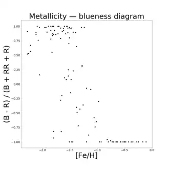 где — количество звёзд, соответственно, в голубой и красной части горизонтальной ветви, а — количество переменных типа RR Лиры. Таким образом, голубизна варьируется от −1 для скоплений, где все звёзды горизонтальной части расположены в её красной части, до +1 для скоплений, где все расположены в голубой части. На диаграмме металличность — голубизна для шаровых скоплений видна зависимость между этими величинами, но наблюдается и значительный разброс относительно неё[4][5][6]. Кроме того, иногда отмечается, что в некоторых случаях морфология горизонтальных ветвей довольно сложна: к примеру, она может проявлять бимодальность, и при описании её одним параметром голубизны теряется важная информация[7][8].