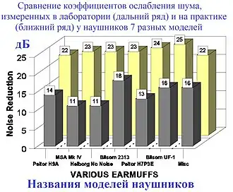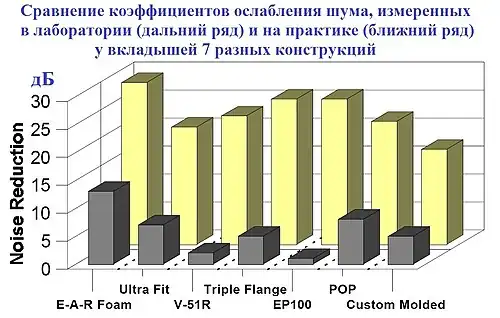 В НИИ Медицины труда считают, что эффективность СИЗ органов слуха ниже лабораторной, по крайней мере, в 2 раза (на 10-15 дБ и более)[23][24]. Исследования специалистов Национального института охраны труда (NIOSH) показали, что при практическом использовании вкладышей их эффективность значительно ниже, чем в лаборатории[25]. Были изучены вкладыши семи различных конструкций (см. диаграмму справа).