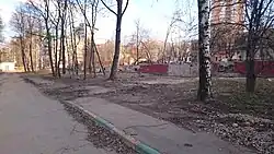 Снесённая пятиэтажка в районе станции метро «Молодёжная». Виден цоколь и сохранившиеся бордюрные камни бывшей дворовой территории