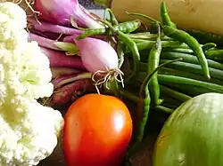 - Овощи — категория, которую иногда объединяют с фруктами. Также иногда в неё добавляют бобовые. По размеру эта категория часто уступает только зерновым продуктам, иногда овощи даже превосходят зерновые[2][3][4]. К овощам относятся, например, шпинат, морковь, лук и брокколи.