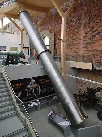 «Проект „Вавилон“» — проект создания серии суперпушек — был запущен под патронажем президента Ирака Саддама Хусейна во время ирано-иракской войны в 1980-х годах. Конструкция основана на исследованиях проекта HARP 1960-х годов под руководством канадского специалиста артиллерии Джеральда Булла. Несмотря на отрывочность сведений, известно, что существовали четыре различных устройства, которые были включены в эту программу. По крайней мере один из проектов «Вавилон» («Большой Вавилон») использовал видоизмененный принцип «теоретического» (многока́морного) артиллерийского орудия. Пушка имела кроме обычного метательного заряда, расположенного в каморе казенника, ещё и присоединённый к снаряду удлинённый заряд метательного ВВ, который двигался вместе со снарядом по мере его продвижения по стволу, тем самым поддерживая в стволе постоянное давление. Девять тонн специального метательного заряда суперпушки могли вести огонь 600-кг снарядом на дальность до 1000 километров, или запускать 2000-кг реактивный снаряд. Такой снаряд мог бы запускать 200-кг спутник на орбиту по цене, которую оценивают в $600 за килограмм[1]. Калибр орудия 1000 мм. Известно об испытаниях прототипа 350-мм калибра.