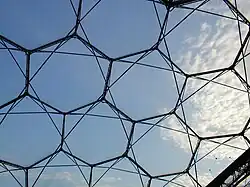 Геодезические купола имеют каркас из стальных труб, образующих шестиугольные рамы с наружными панелями из термопластика ETFE (этилентетрафторэтиленовых «подушек»[2]). Диаметр стальных трубок, из которых состоит каркас, всего 193 мм — филигранная структура сродни паучьей сети.[2] От использования стекла было решено отказаться из-за его веса и потенциальной опасности. Наружные панели изготовлены из многослойной плёнки (прозрачной фольги) ETFE, пропускающей ультрафиолетовые лучи. По сравнению со стеклом ETFE стоит вдвое меньше, имеет лучшие качества температурной изоляции и пропускает больше ультрафиолета, что для растений чрезвычайно важно. Она весит 1 % от веса стекла, делая всю структуру легче, чем воздух, в ней содержащийся: если ветер подует в нужном направлении, и если не будет достаточного крепежа, пузыри просто унесёт.[2] Другой недостаток в том, что срок службы фольги — 25 лет (возможно, к сроку замены фольги ETFE будет изобретен новый, ещё более подходящий для данных нужд материал). Панели скреплены по периметру и наполнены воздухом, образуя таким образом большую воздушную подушку, предохраняющую оранжереи от потери тепла. Материал ETFE устойчив к большинству загрязнений, которые просто смываются дождём. При необходимости мытьё наружной поверхности может быть организовано при помощи альпинистов.