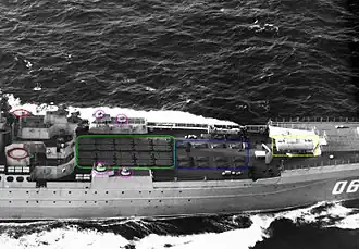«Смерч-3» — дальность — 1000 м, масса снаряда — 196 кг. Установлены в кормовой части на верхней палубе по обоим бортам.