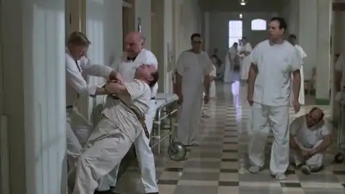 В ходе консилиума лечащие врачи склоняются к тому, что Макмёрфи — симулянт и его необходимо отправить назад в тюрьму отбывать срок. Однако старшая медсестра Рэтчед настаивает на том, чтобы оставить его в отделении. Задержанный для принудительного лечения, Макмёрфи неожиданно для себя узнаёт, что большинство пациентов в отделении находится добровольно и его попытки посягнуть на власть медсестры совершенно бессмысленны. Купаясь в бассейне, Рэндл обменивается угрозами с санитаром Вашингтоном, после чего Вашингтон информирует его, что срок пребывания в больнице может длиться неопределённо долго по воле медиков, и он решает бежать.