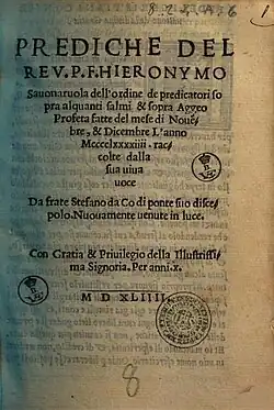 - Prediche del reu. p.f. Hieronymo Sauonaruola dell'ordine de predicatori sopra alquanti salmi & sopra Aggeo profeta fatte del mese di nouembre, & dicembre l'anno 1494. raccolte dalla sua uiua uoce da frate Stefano da Co di ponte suo discepolo. Archive.org. Дата обращения: 9 декабря 2020.