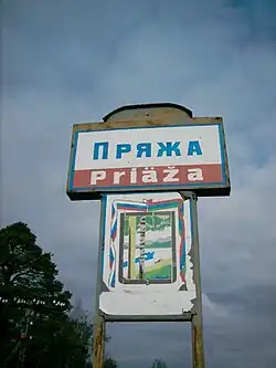 Указатель при въезде в пос. Пряжа с гербом района