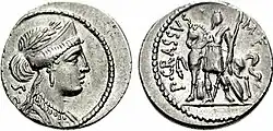В конце 56 или в начале 55 года до н. э. Публий вернулся в Рим. С собой он привёл тысячу галльских всадников, присутствие которых в столице помогло избранию консулами на 55 год Красса и Помпея[28][29]. После этого Красс чеканил монету; возможно, он занял должность монетного триумвира, а по одной из версий — квестора[30][31]. Сохранились денарии Публия, на реверсе которых видны надпись P. Crassus M. f. (Публий Красс, сын Марка) и изображение женщины с копьём, ведущей коня, а на аверсе — голова Венеры в лавровом венке. Монетарий мог иметь в виду либо генеалогию своего командира Цезаря (потомка Венеры[32]), либо храм Венеры Эрицинской у Коллинских ворот, рядом с которым в 82 году до н. э. благодаря Марку Крассу была одержана решающая победа над марианцами[24].