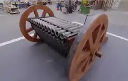 Эта идея стала основой создания «33-ствольного органа» — орудия, состоявшего из трех рядов по 11 малокалиберных пушек, ряды соединялись в виде треугольной вращающейся платформы, к которой в свою очередь прикреплялись большие колёса.