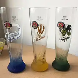 Пшеничное пиво традиционно пьют из особых высоких, стройных стаканов. Форма стакана так выбрана, чтобы пузырьки углекислого газа медленно поднимались по напитку. Тем самым пиво дольше останется «свежим». Стаканы имеют узкую среднюю часть, широкую сферообразную верхнюю часть и массивное тяжёлое дно (для устойчивости стакана из-за формы средней и верхней части стакана). Чокаются традиционно днищами стаканов, не в последнюю очередь по этой причине они сделаны массивными. Непосредственно перед наливанием стаканы моют в холодной воде, чтобы держать под контролем сильное развитие пены, которое характерно для пшеничного пива. Давнюю традицию, (особенно в Баварии), имеет спор о том, как правильно наливать пиво в стакан. Одни предпочитают наклонять стакан и осторожно в него наливать пиво. Другие надевают стакан на бутылку и быстро опрокидывают её.