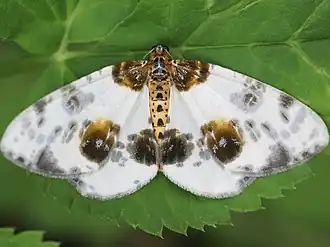 Размах крыльев до 4,3 см[2] (по другим данным — до 3,5 см[3]). Передние крылья белые с круглыми, нечётко очерченными светло-серыми пятнами разного размера; у основания и задних углов крыльев — более крупные тёмно-бурые с оранжевым пятна. Задние крылья окрашены сходным образом. Брюшко жёлтого цвета, с чёрными пятнышками[2][3][4].