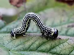 Гусеница длиной до 3,4[2] или 4[3] см. Окраска синевато-белая с жёлтым, в чёрно-синих полосках или пятнах; спинная полоса чёрная; голова чёрная[2][3].