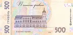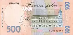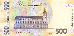 На реверсной стороне банкноты размещено изображение здания Староакадемического корпуса Киево-Могилянской академии. На фоне изображена использовавшаяся в XVIII веке печать Киево-Могилянской академии с круговой латинской надписью «ACADEMIA KIIOVIENSIS SIGILLUM» и изображением Староакадемического корпуса в центре. Справа от изображения академии — вертикальная надпись «Києво-Могилянська академія». Слева от изображения академии расположена иллюстрация к произведению «Пифагоровый треугольник» в виде треугольника с глазом, вписанного в окружность, с размещёнными по углам греческими буквами α, β и ω. Также обратная сторона банкноты содержит серию (две буквы) и номер (семь цифр) банкноты; номинал, указанный числом и прописью («П’ятсот гривень»); год и место печати («Київ 2006»); вертикальную надпись «УКРАЇНА».
