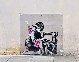 - ↑ «'Missing' Banksy art Slave Labor (Bunting Boy) on auction in Miami for $500,000», Global Post, (20 февраля 2013). Дата обращения: 17 августа 2019. Архивировано 24 сентября 2015 года.
