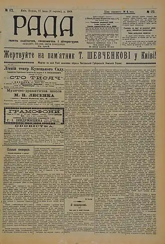 «Рада» возникла как непосредственное продолжение газеты «Громадська думка» («Общественная мысль», 1905—1906), запрещённой властями. Выходила в Киеве с 15 сентября 1906 до 2 августа 1914 года. Издавал и финансировал её Евгений Чикаленко, при некоторой материальной поддержке Василия Симиренко, Леонида Жебунёва, Петра Стебницкого, Владимира Леонтовича.