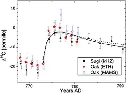 Пик углерода-14 в 774 году н. э. Цветными точками показаны измерения деревьев. Чёрная линия — смоделированные данные