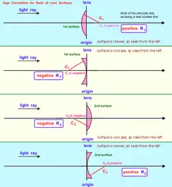 Однако обратите внимание, что в других областях оптики, помимо проектирования оптических систем, иногда используются другие условные обозначения. В частности, во многих учебниках по физике используется гауссовское соглашение о знаках, согласно которому выпуклые поверхности линз всегда имеют положительную кривизну[3]. Следует соблюдать осторожность при использовании формул, взятых из разных источников.