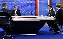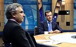• В течение 2009 года Дмитрий Медведев ежемесячно давал интервью федеральным каналам: «Первому каналу», «России» и «НТВ» (телеканалы менялись каждый месяц по очереди). Они выходили, как правило, по воскресеньям в итоговых информационно-аналитических программах телеканалов. Основной темой всех интервью стала борьба России с последствиями экономического кризиса.