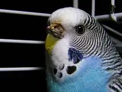 (1924 год, Франция) У волнистых попугайчиков этого окраса серо-синие (с переходом к розовому или фиолетовому оттенку) нижняя часть спины, живот, грудь, белая маска, чёрные горловые знаки, на щеках фиолетовые пятна, хвостовые перья тёмно-синие.