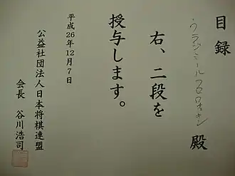 - Любители в Японии могут получить 1—7 дан (формально, с 2010 года можно получить и 8 любительский дан, 4 раза завоевав любительский титул рюо[5]). Высшие любительские даны может присваивать лишь NSR, а низшие — также и руководители местных японских клубов сёги.