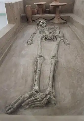 Было обнаружено 11 скелетов, захороненных головами в северном направлении. Рядом с этими скелетами была положена посуда для повседневного использования. Три женщины имели браслеты на левом запястье. Возле одного женского скелета был найден золотой браслет. Кроме того, полудрагоценные камни были найдены около головы, видимо, будучи частью какого-то ожерелья. В костях захороненных были обнаружены яйца паразитов.