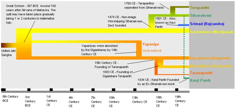 Первый раскол в джайнизме произошел примерно в четвертом веке до нашей эры, что привело к возникновению двух основных течений, Дигамбары и Шветамбары, которые позже были разделены на другие подтечения.[1]