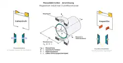 Индуцированное напряжение измеряется либо двумя электродами, находящимися в контакте со средой, либо ёмкостными электродами, не контактирующими со средой, и передаётся в преобразователь сигналов. Преобразователь сигналов усиливает сигнал и преобразует его в стандартный токовый сигнал (4—20 мА), а также в частотно-импульсный сигнал (например, один импульс на каждый кубический метр измеряемой среды, прошедшей через измерительную трубу). Принцип действия электромагнитных расходомеров основан на взаимодействии движущейся электропроводной жидкости с магнитным полем. При движении жидкости в магнитном поле возникает ЭДС, как в проводнике, движущемся в магнитном поле. Эта ЭДС пропорциональна скорости потока, и по скорости потока можно определить расход.