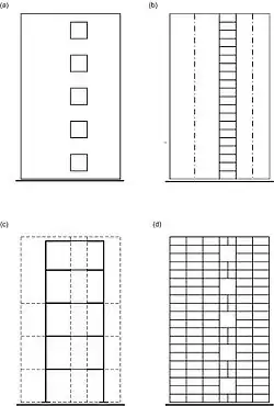 Примеры двухмерных расчётных схем стены с проёмами, являющейся вертикальной диафрагмой жёсткости здания, показаны на рисунке справа.