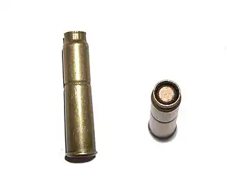 - Патрон с фланцевой латунной гильзой, оболочечной пулей и бездымным порохом.