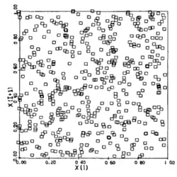 Линейный конгруэнтный генератор показывает плохую n-пространственную однородность. На рисунке предвиден пример результата работы для для 384 точек (a) и 512 (b).[1]