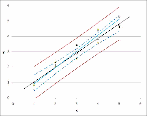 где t(1−α/2, n−2) — t-значение распределения Стьюдента. На рисунке показана линия регрессии, построенная по 10 точкам (сплошные точки), а также 95%-я доверительная область линии регрессии, которая ограничена пунктирными линиями. С 95%-й вероятностью можно утверждать, что истинная линия находится где-то внутри этой области. Или иначе, если мы соберём аналогичные наборы данных (обозначены кружками) и построим по ним линии регрессии (обозначены голубым цветом), то в 95 случаях из 100 эти прямые не покинут пределов доверительной области. (Для визуализации кликните по картинке) Обратите внимание, что некоторые точки оказались вне доверительной области. Это совершенно естественно, поскольку речь идёт о доверительной области линии регрессии, а не самих значений. Разброс значений складывается из разброса значений вокруг линии регрессии и неопределённости положения самой этой линии, а именно: