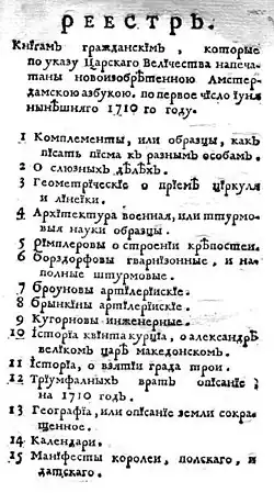 «Реестр книгам гражданским» размещался на одной странице и представлял собой перечень из 15 книг: 1. Комплементы или образцы, как писать письма к разным особам. 2. О слюзных делах. З. Геометрические о приеме циркуля и линейки. 4. Архитектура военная, или штурмовые науки образцы. 5. Римплеровы о строении крепостей. 6. Борздорфовы гарнизонные, и наполные штурмовые. 7. Броуновы артиллерийские. 8. Брынкины артиллерийские. 9. Кугорновы инженерные. 10. История квинта курциа, о Александре Великом царе македонском. 11. История о взятии града Трои. 12. Триумфальных врат описание на 1710 год. 13. География, или описание земли сокращенное. 14. Календари. 15. Манифесты королей, польского и датского[2].