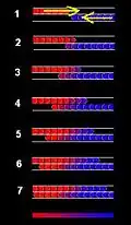 Схема, поясняющая работу противоточного теплообменника. Холодное тело подаётся слева при температуре Т1. Горячее — справа при температуре Т8. Температуры Т2…Т6 везде попарно меньше температур Т13…Т9, т.е. Т2 < Т133 < Т12 и т.п.