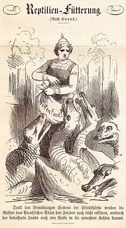 На мешке надпись «Вельфский фонд». Надпись под карикатурой: «Усилиями Виндтхорста так и не прояснены планы Вельфов относительно мира с Пруссией, так что средства под вопросом пока идут не в те глотки»