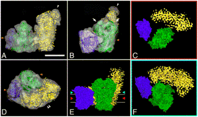 Суперкомплекс I/III/IV. Комплекс I показан жёлтым, комплекс III — зелёным, а комплекс IV — фиолетовым. Рисунки A, B, и E показывают боковой вид комплексов, расположенных в мембране. Горизонтальная линия на рисунке E показывает обозначает мембраны. На рисунке D даётся вид из межмебранного пространства. C и F дают вид из матрикса.