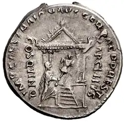 Реверс: Тетрастильный храм Юпитера Феретрия, перед которым фигура Марка Клавдия Марцелла в тоге, несущего трофей. Надпись «IMP. CAES. TRAIAN. AVG. GER. DAC. P. P. REST.» В поле, слева и справа: «MARCELLVS COS. QVINQ.», аббревиатура от лат. Marcellus consul quinquies.