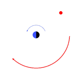 Ретроградная орбита: красный спутник вращается по часовой стрелке вокруг сине-чёрной планеты, которая, в свою очередь, вращается против часовой стрелки.