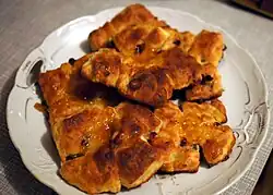 Реформаторская булочка Представляет собой сладкую выпечку с конфитюром из дрожжевого теста с изюмом квадратной или округлой формы диаметром около 13 см, которая символизирует розу Лютера — печать, которой реформатор скреплял свою переписку. Считается, что реформаторская булочка является своеобразным ответом протестантов на сладкий «мартинский брецель», который немецкие католики по традиции выпекали ко Дню святого Мартина[3]. В отличие от розы Лютера у реформаторской булочки только четыре «лепестка», красное сердце с крестом в середине обозначается конфитюром и двумя наложенными сверху перекрещенными полосками теста. В течение нескольких недель в преддверии праздника реформаторские булочки можно увидеть на витринах многих саксонских булочных[4].