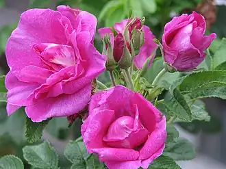 Цветки махровые, тёмно-розовые с фиолетовым оттенком, диаметром около 7 см. В группах по 3—7 штук[3].