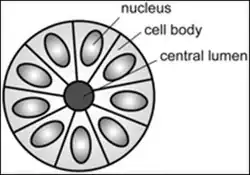Розетка это клеточная структура, состоящая из клеток, окружающая центральное «ядро» в виде «колеса со спицами». Центр розетки может иметь кажущийся пустым просвет или быть заполненным цитоплазматическими отростками окружающих клеток. Цитоплазма каждой клетки розетки часто имеет форму клина, направленного в центр розетки, ядра клеток находятся на периферии и образуют кольцо или «нимб» вокруг розетки.[2]