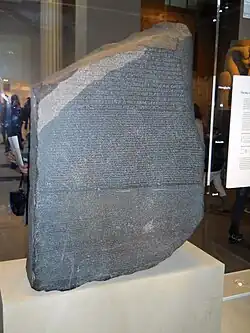 Розе́ттский ка́мень — стела из гранодиорита, найденная в 1799 году в Египте возле небольшого города Розетта (теперь Рашид), недалеко от Александрии, с выбитыми на ней тремя идентичными по смыслу текстами, в том числе двумя на египетском языке — начертанными египетскими иероглифами и египетским демотическим письмом, которое представляет собой сокращённую скоропись эпохи позднего Египта, и одним на древнегреческом языке. Древнегреческий был хорошо известен лингвистам, и сопоставление трёх текстов послужило отправной точкой для расшифровки египетских иероглифов. С 1802 года Розеттский камень хранится в Британском музее (инвентарный номер EA 24).