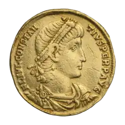 Аверс:Бюст Констанция II в доспехах, в фас. На голове шлем с нашлемником, в руках щит и копьё. Реверс:Рома и Константинополь сидят на тронах и держат щит с надписью «VOT/XXX/MVLT/XXXX». В левой руке Ромы копьё, Константинополь держит скипетр. Клеймо монетного двора: «SMNC». |