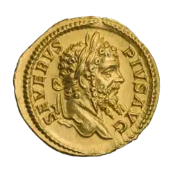 Аверс:Легенда: «SEVERVS PIVS AVG». Голова Септимия Севера в лавровом венке, вправо. Реверс:Легенда: «RESTITVTOR VRBIS». Рома сидит на троне без спинки, влево. В руках палладиум и скипетр, внизу у трона стоит щит. |