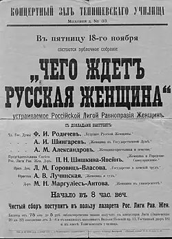 В последующие две недели Лига развернула бурную пропагандистскую кампанию[31]. Воззвание к женщинам Петрограда с призывом бороться за политическое равноправие женщины было распечатано тиражом в 35 000 экземпляров. Воззвания раздавали на улицах, они были расклеены по городу, разосланы в женские учебные заведения, на фабрики, заводы и мастерские, в иногородние отделения Лиги и в другие женские организации[36].