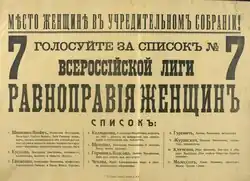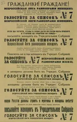Временное правительство подтвердило эти опасения меньше чем через неделю после своего формирования[31]. Декларация от 3(16)марта1917 года объявляла об отмене всех сословных, религиозных и национальных ограничений и о немедленной подготовке к созыву Учредительного собрания «на началах всеобщего, равного, тайного и прямого голосования», но не упоминала о распространении избирательных прав на женщин. «Когда речь заходит о правах, то под словом „всеобщее“ мужчины подразумевают только самих себя», — прокомментировала председательница Женской Прогрессивной партии Мария Покровская[27].