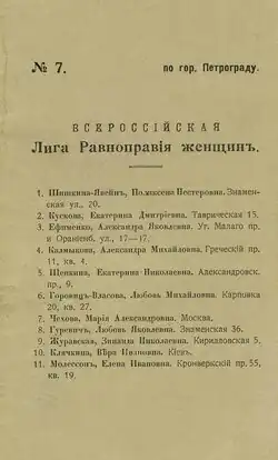 К 1917 г. в Петрограде действовало не менее сорока женских организаций (Женское взаимно-благотворительное общество, Петербургский женский клуб и пр.), хотя не все из них боролись за политическое равноправие[34]. Лига равноправия женщин оказалась на тот момент самой многочисленной и активной из организаций и возглавила борьбу за политические права[35].