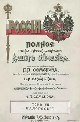 - Россия. Полное географическое описание нашего Отечества : настольная и дорожная книга для русских людей / под ред. В. П. Семенова ; под общ. рук. П. П. Семенова и В. И. Ламанского ; [предисл. В. Семенова]. - СПб. : А. Ф. Девриен, 1899-1914. - С 5-го т. : под ред. В. П. Семенова-Тян-Шанского и под общ. рук. П. П. Семенова-Тян-Шанского и В. И. Ламанского.